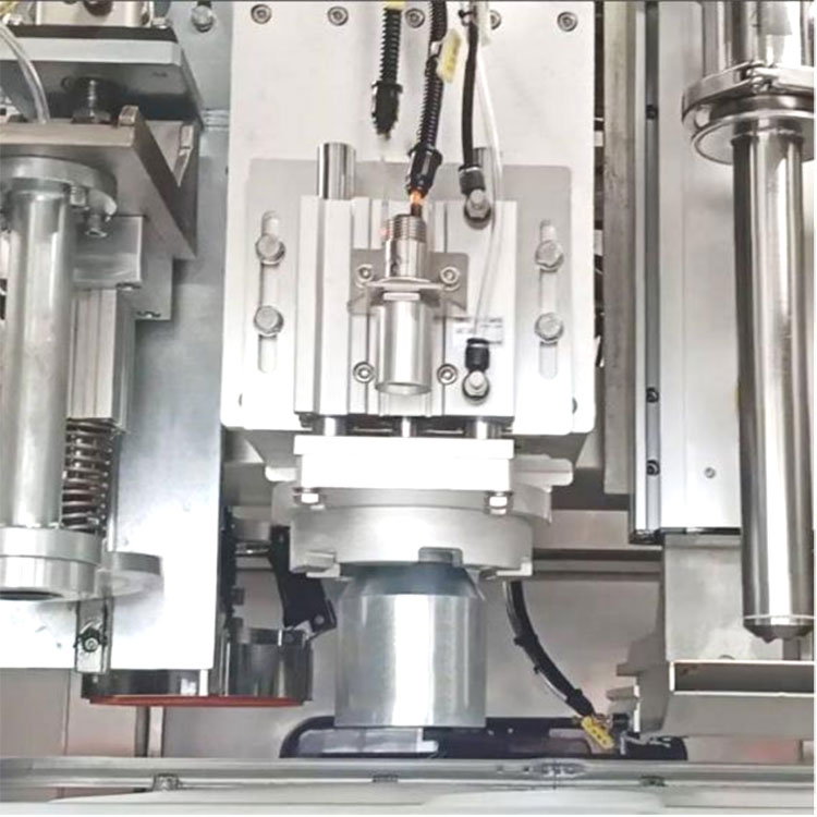 Det vandtætte dæksel placeres manuelt i dækslet, automatisk sekventiel forsyning. Den vandtætte dækselpresseanordning absorberer det vandtætte dæksel, der automatisk placeres ved spandmundingen for at trykke på dækslet.